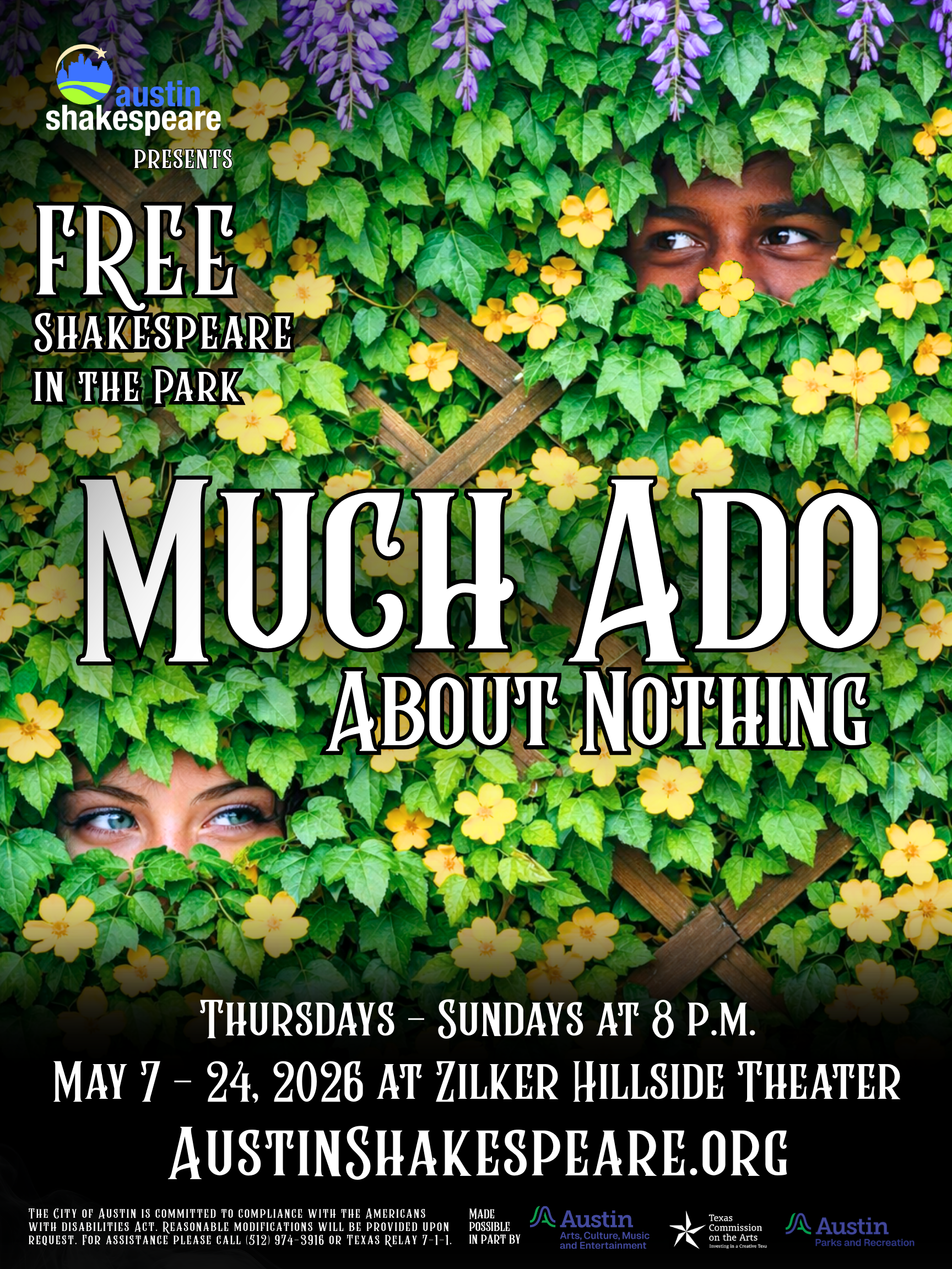 In Messina, everyone is an expert on love and a complete disaster at it. Austin Shakespeare brings William Shakespeare's Much Ado About Nothing to Zilker Hillside Theatre from May 7–24, 2026. Admission is free, although donations will be accepted.